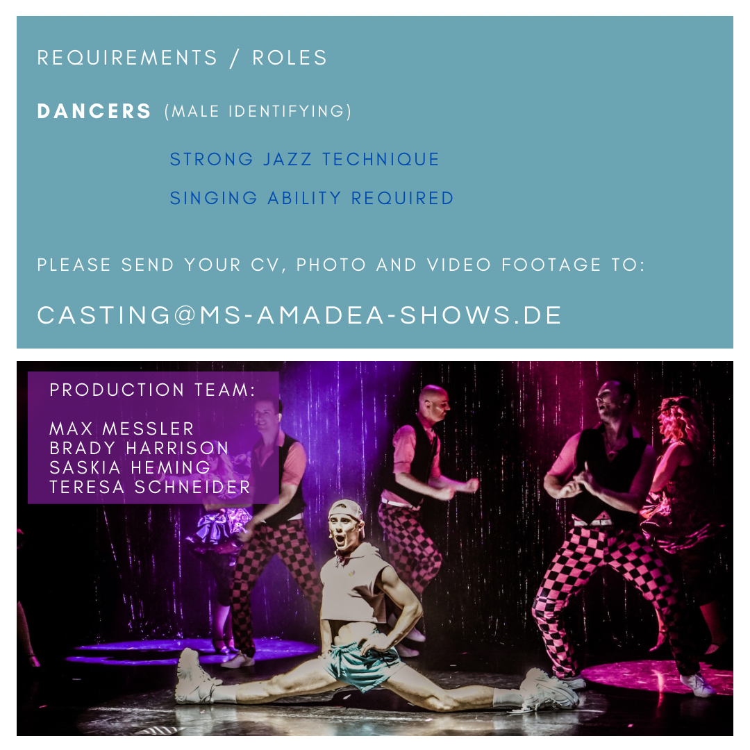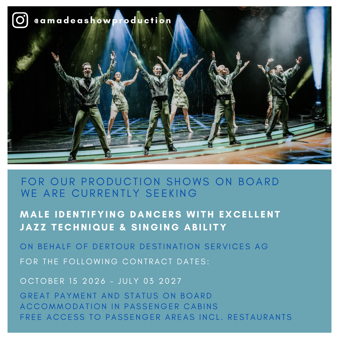 Manchester Open Dancer Call 10 Apr 2026 Open Call Northern Ballet School, The Dancehouse 10 Oxford Rd, Manchester M1 5QA, UK 10:00 - Open Dancer Call OPEN CALL SIGN UP BEGINS A HALF HOUR BEFORE YOU CAN NOT PRE-REGISTER AHEAD OF THE DAY. YOU CAN ONLY SIGN UP ON THE DAY OF THE AUDITION. Dancers should be warmed up and ready to dance in appropriate dance attire and shoes with a picture and current resume. Women should bring character heels and a flat dance shoe or sneakers you can turn in. Men should wear dance shoes that they can turn in or sneakers. You will not be allowed to dance barefoot or in socks. SEEKING: THEATRICAL SHOW DANCERS -Fit, athletic dancers with strong technical training and outgoing personalities. Actively seeking all ethnicities and genders. No singing required DANCERS WITH AERIAL EXPERIENCE - Fit, athletic dancers with strong technical training and outgoing personalities. Actively seeking all ethnicities and genders. No singing required DANCERS WHO SING - Playing age should be mid 20's to late 30's. Fit, athletic dancers with strong technical training and outgoing personalities. Actively seeking all ethnicities and genders. Female Dancers must have a full rock belt to at least C above middle C. Male Dancers must have a minimum of a sustained G4. Must be strong actors and have a good sense of comic timing. London - Open Dancer Call 13 Apr 2026 Open Call Pineapple Dance Studios, 7 Langley St., London WC2H 9JA, UK 10:00 - Open Dancer Call OPEN CALL SIGN UP BEGINS A HALF HOUR BEFORE YOU CAN NOT PRE-REGISTER AHEAD OF THE DAY. YOU CAN ONLY SIGN UP ON THE DAY OF THE AUDITION. Dancers should be warmed up and ready to dance in appropriate dance attire and shoes with a picture and current resume. Women should bring character heels and a flat dance shoe or sneakers you can turn in. Men should wear dance shoes that they can turn in or sneakers. You will not be allowed to dance barefoot or in socks. SEEKING: THEATRICAL SHOW DANCERS -Fit, athletic dancers with strong technical training and outgoing personalities. Actively seeking all ethnicities and genders. No singing required DANCERS WITH AERIAL EXPERIENCE - Fit, athletic dancers with strong technical training and outgoing personalities. Actively seeking all ethnicities and genders. No singing required DANCERS WHO SING - Playing age should be mid 20's to late 30's. Fit, athletic dancers with strong technical training and outgoing personalities. Actively seeking all ethnicities and genders. Female Dancers must have a full rock belt to at least C above middle C. Male Dancers must have a minimum of a sustained G4. Must be strong actors and have a good sense of comic timing.